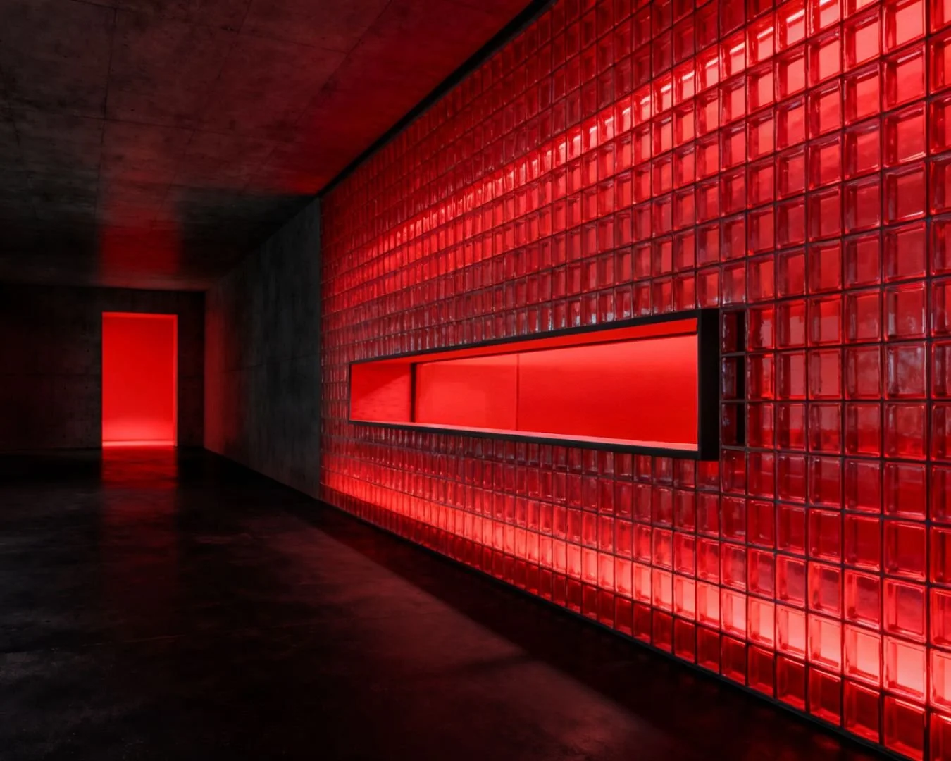 The unisex bathrooms run along the outer perimeter of the club, accessible from all sides. The primary material in the bathroom is black tile, floor to ceiling, forming long, graphic corridors. Red light filters through backlit glass blocks overhead, creating flattering, atmospheric illumination.