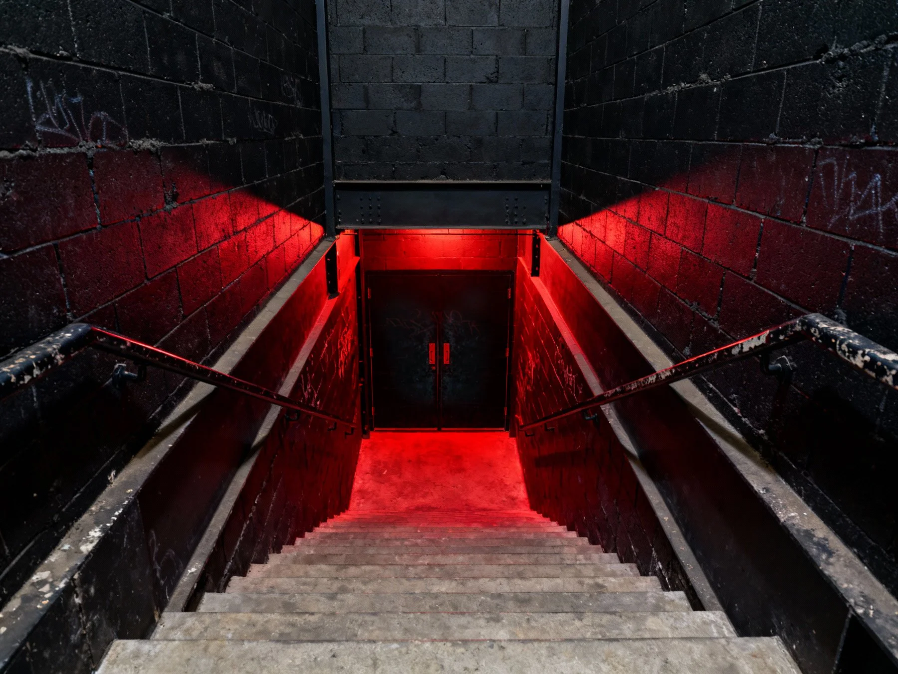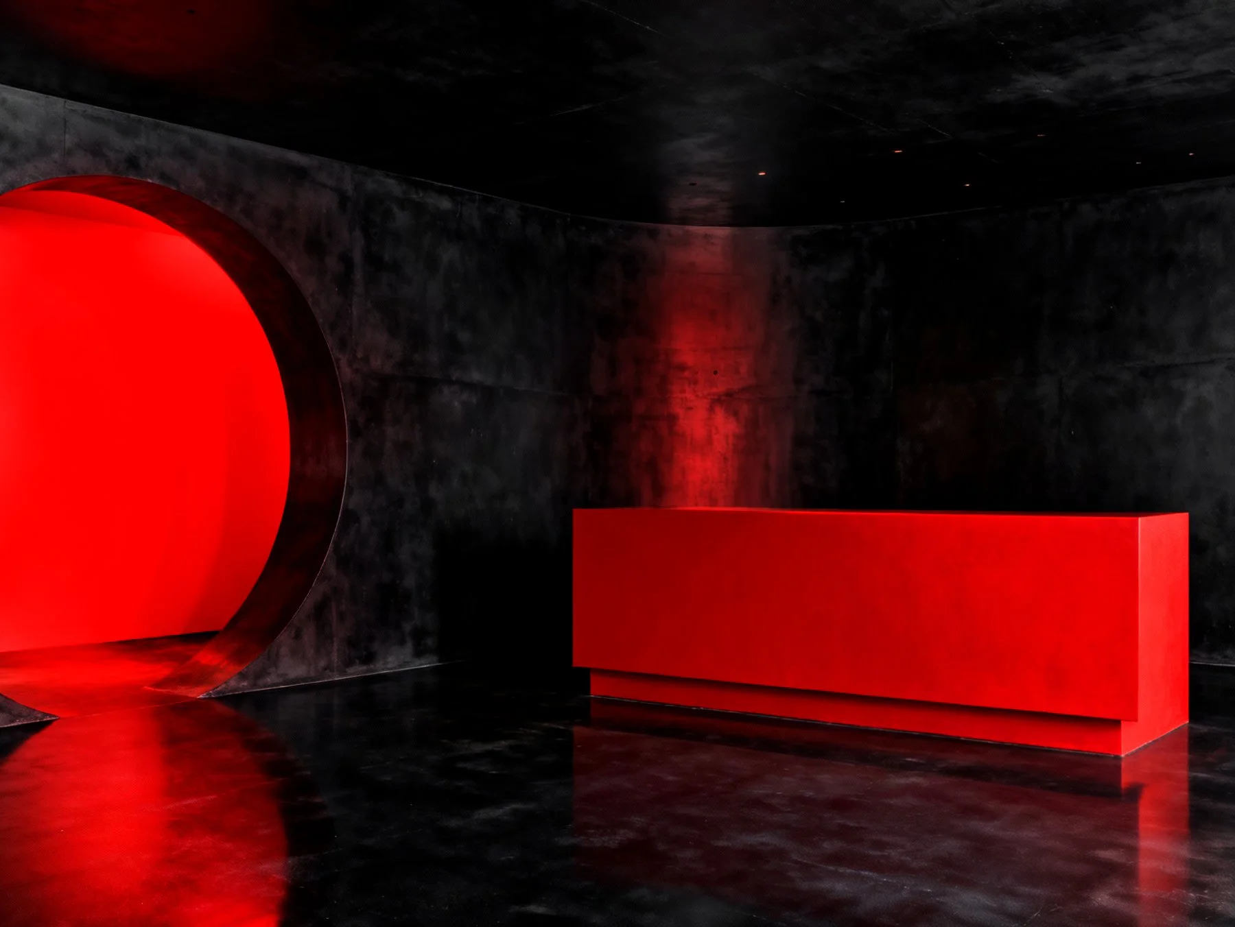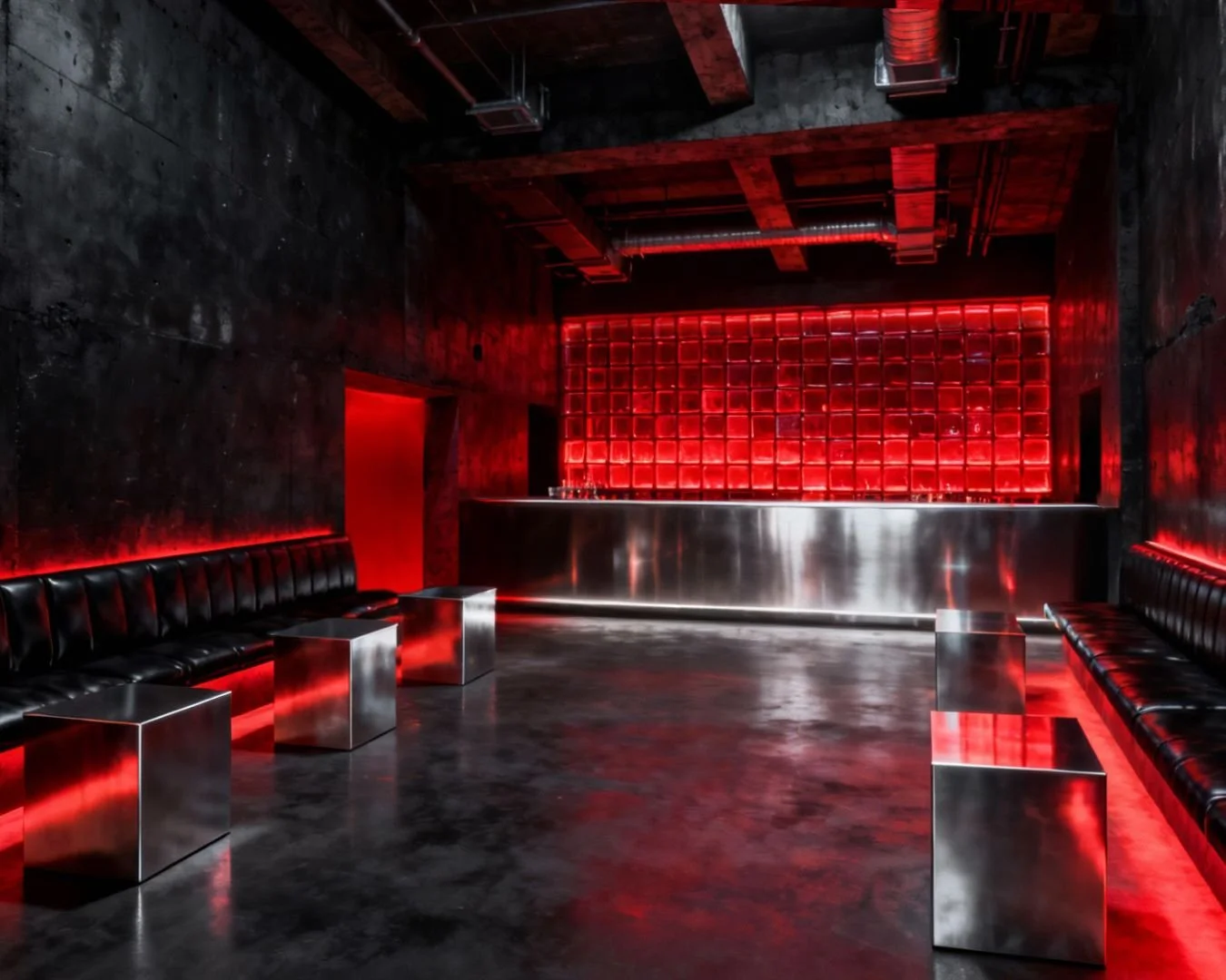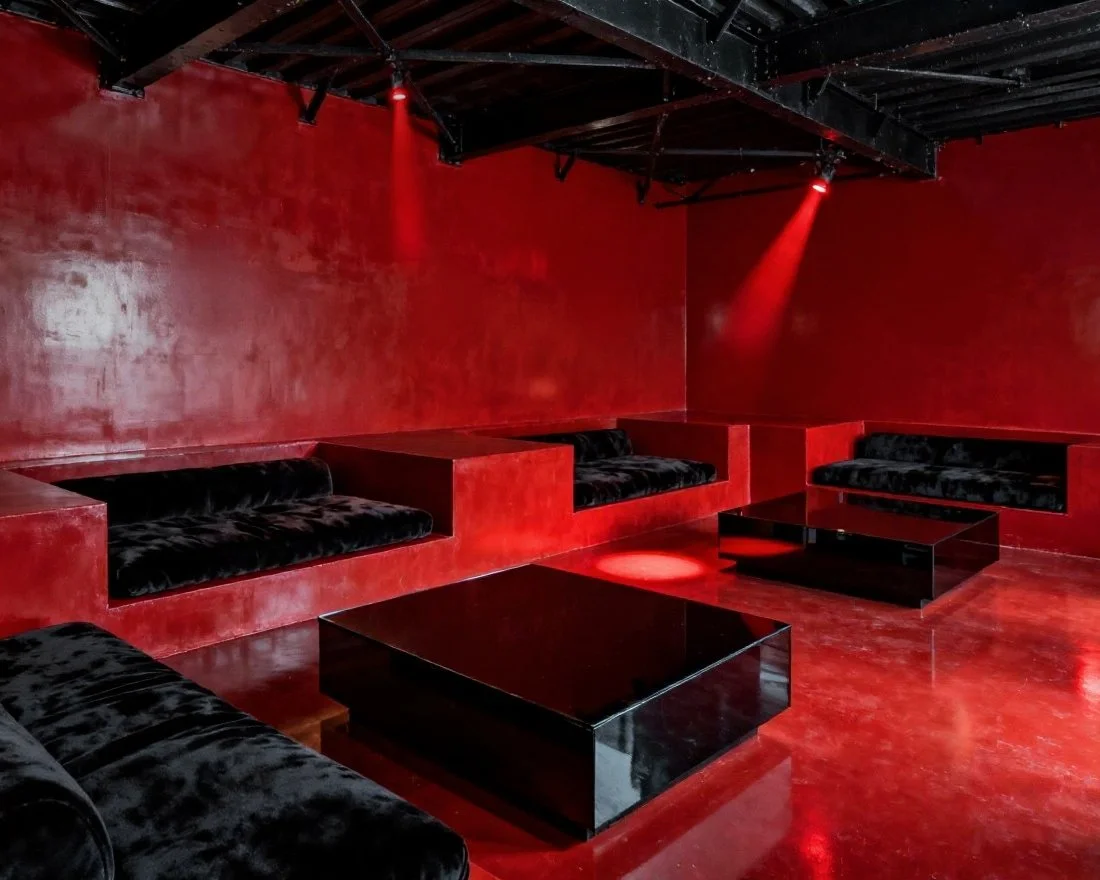 The main floor delivers the loud, high-energy core of the club, anchored by black concrete interiors, dim red lighting, exposed pipes, and glass block accents. The upper level offers a contrasting experience: an intensely red VIP world with bottle service, private entrances, crushed velvet seating, and a more social, lounge-oriented atmosphere. Below it all, the basement shifts into something darker and more intimate — a raw, unfinished maze designed for those who enjoy being lost, exploring, and moving between different forms of connection.